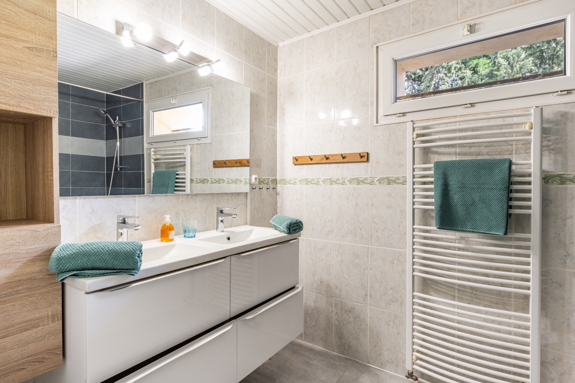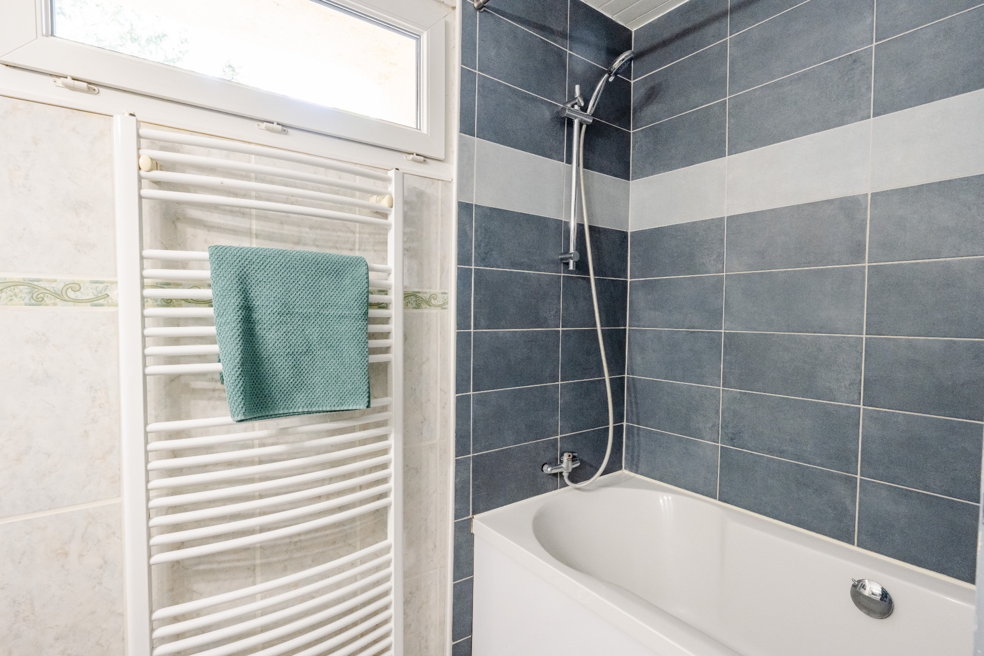 Kamer Tournesol deelt een badkamer met bad-douche en 2 lavabo's met 3 andere kamers. Naast deze badkamer bevindt zich een apart toilet.